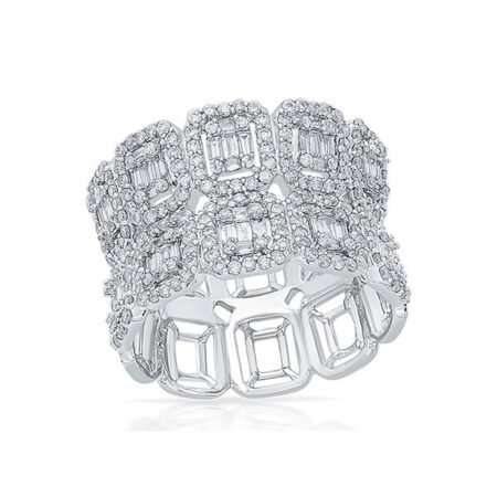 A classic graceful single haloed dual-lined cocktail ring in white gold with a totality of ten halos enveloping clustered baguettes. This Slea Luxe ring is inspired by a divine queenly look making it a symbol of royalty.