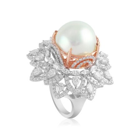 An awe-inspiring diamond ring from the Royal Collection. An exquisite Shea Luxe WHITE GOLD ring with brilliant rounds, Marquise, and princess cut bars takes a shape of a flower with a south sea pearl at the top like a queen. This ring is a symbol of queenship.